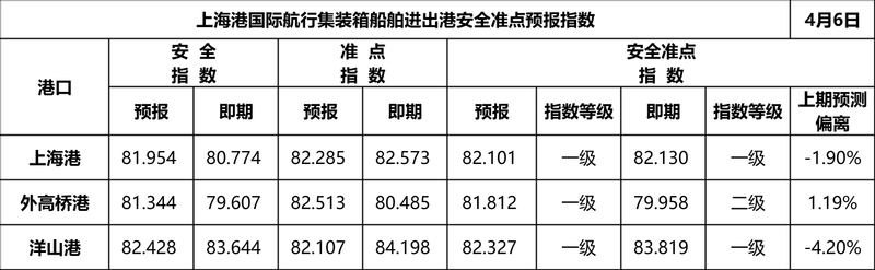通过对上海港水域的预测通航环境、船舶预计抵港时间申报准确性(预计抵港准点率)、预测船舶航行动态等多维数据进行深入分析,形成进出港通航安全预报评价指标体系和准点预报评价规则,编制并发布上海港国际航行集装箱船舶进出港安全准点预报指数,并于每个工作日发布当天的预报指数结果(例如:10月17日发布10月17日的预报指数结果)和前一天的即期指数结果(例如:10月17日发布10月16日的即期指数结果)。