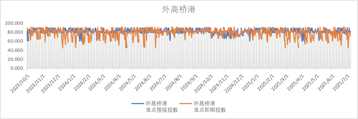 通过对上海港水域的预测通航环境、船舶预计抵港时间申报准确性(预计抵港准点率)、预测船舶航行动态等多维数据进行深入分析,形成进出港通航安全预报评价指标体系和准点预报评价规则,编制并发布上海港国际航行集装箱船舶进出港安全准点预报指数,并于每个工作日发布当天的预报指数结果(例如:1017日发布1017日的预报指数结果)和前一天的即期指数结果(例如:1017日发布1016日的即期指数结果)