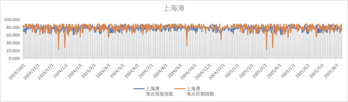通过对上海港水域的预测通航环境、船舶预计抵港时间申报准确性(预计抵港准点率)、预测船舶航行动态等多维数据进行深入分析,形成进出港通航安全预报评价指标体系和准点预报评价规则,编制并发布上海港国际航行集装箱船舶进出港安全准点预报指数,并于每个工作日发布当天的预报指数结果(例如:10月17日发布10月17日的预报指数结果)和前一天的即期指数结果(例如:10月17日发布10月16日的即期指数结果)。