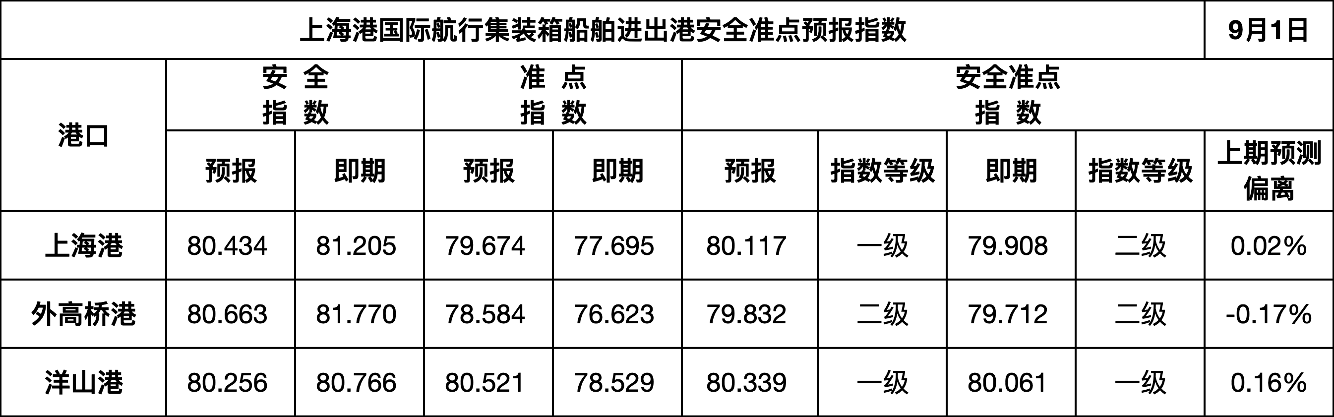 【发布】上海港国际航行集装箱船舶进出港安全准点预报指数(8.30-9.1)