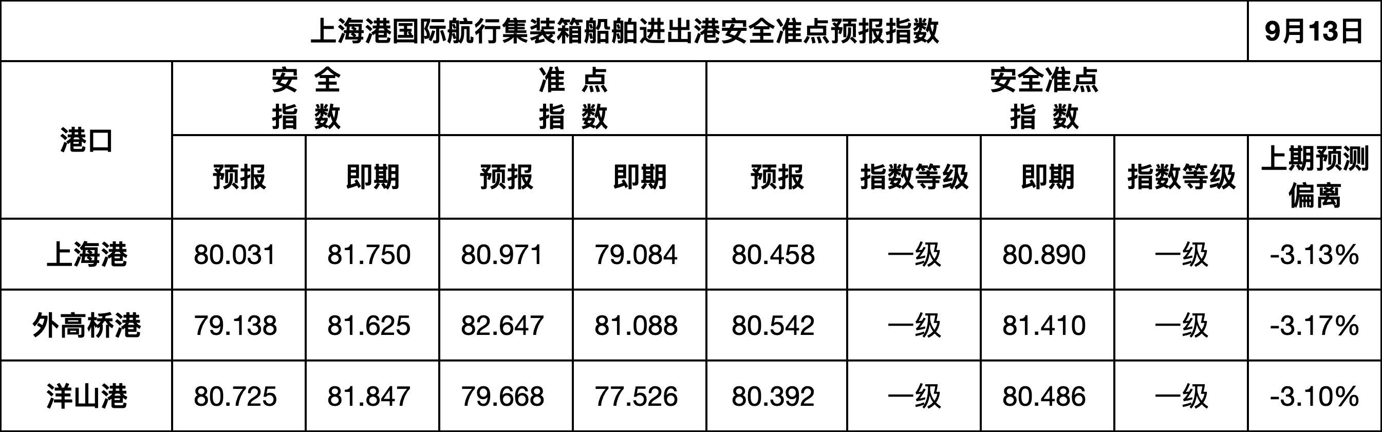 【发布】上海港国际航行集装箱船舶进出港安全准点预报指数(9.13-9.15)