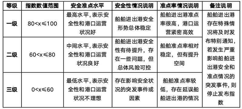 通过对上海港水域的预测通航环境、船舶预计抵港时间申报准确性(预计抵港准点率)、预测船舶航行动态等多维数据进行深入分析,形成进出港通航安全预报评价指标体系和准点预报评价规则,编制并发布上海港国际航行集装箱船舶进出港安全准点预报指数,并于每个工作日发布当天的预报指数结果(例如:10月17日发布10月17日的预报指数结果)和前一天的即期指数结果(例如:10月17日发布10月16日的即期指数结果)。