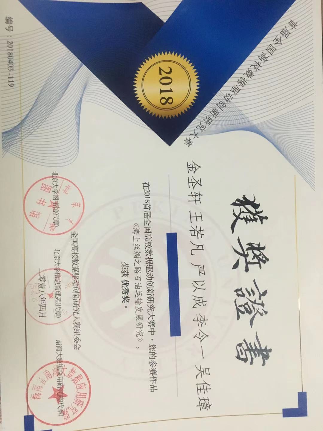 2017年,首届全国高校数据驱动创新研究大赛,大数据研究报告“海上丝绸之路石油运输发展研究”,获优秀奖,主办单位:北京大学图书馆、北京大学信息管理系、南海大数据应用研究院。