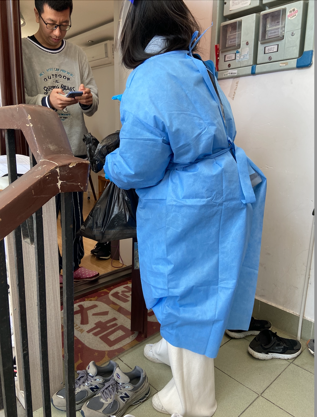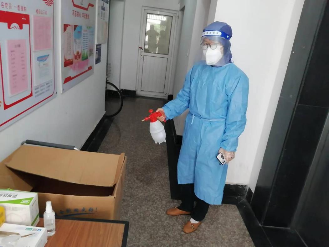 办公室主任戴瑾每个工作日都有固定的时间参加洋泾街道名门世家居委会楼栋志愿者活动,维持楼栋出入秩序,进行楼道消毒,并帮助楼内居民传递所需的生活物资。
