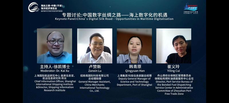 上海国际航运研究中心航运信息研究所所长徐凯主持“2022海丝之路·中国(宁波)海洋经济博览会——智慧港口创新峰会”