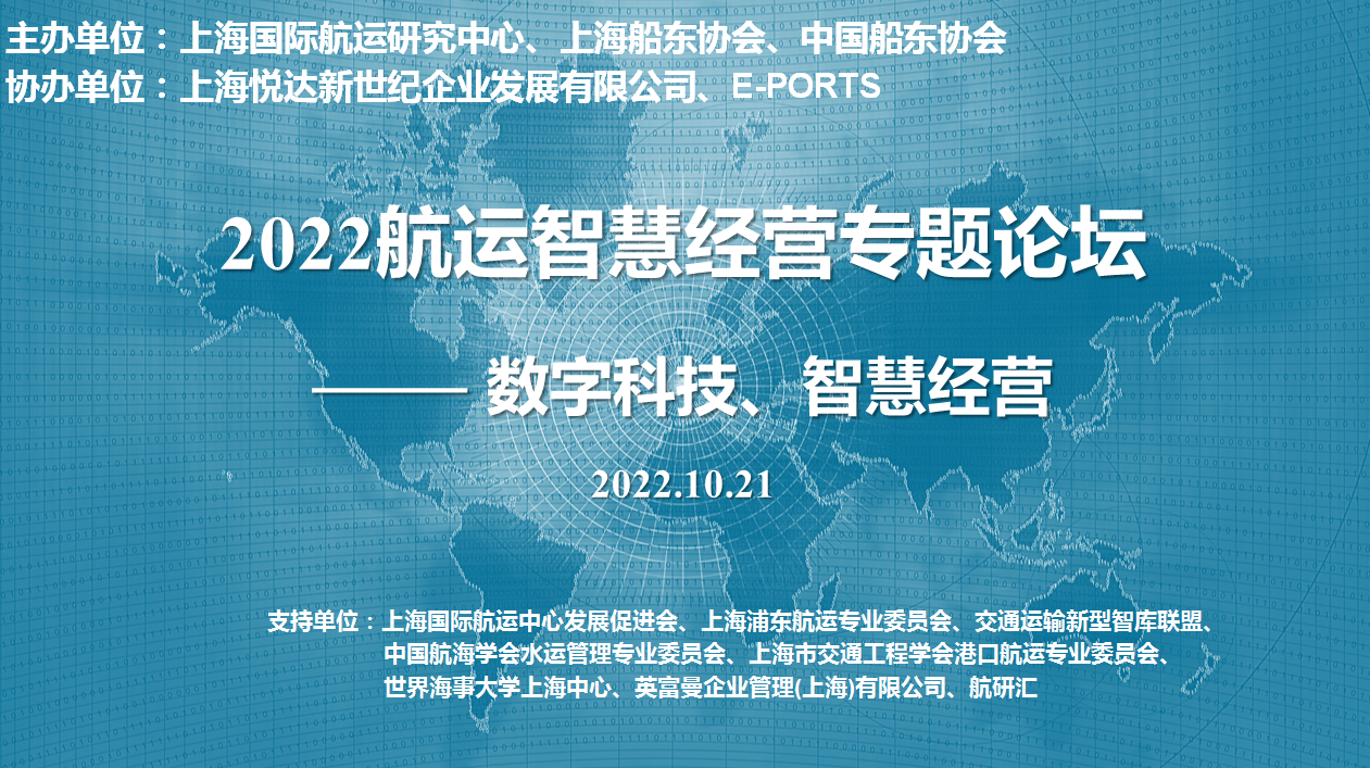 2022年10月21日下午,“2022航运智慧经营专题论坛”成功召开。本次论坛聚焦船舶供应领域数字化发展的探索和应用,邀请专家深入解读,共同探讨,旨在为航运业船舶智慧经营新业态发展提供经验分享和建议。论坛由中国船东协会、上海船东协会和上海国际航运研究中心联合主办。