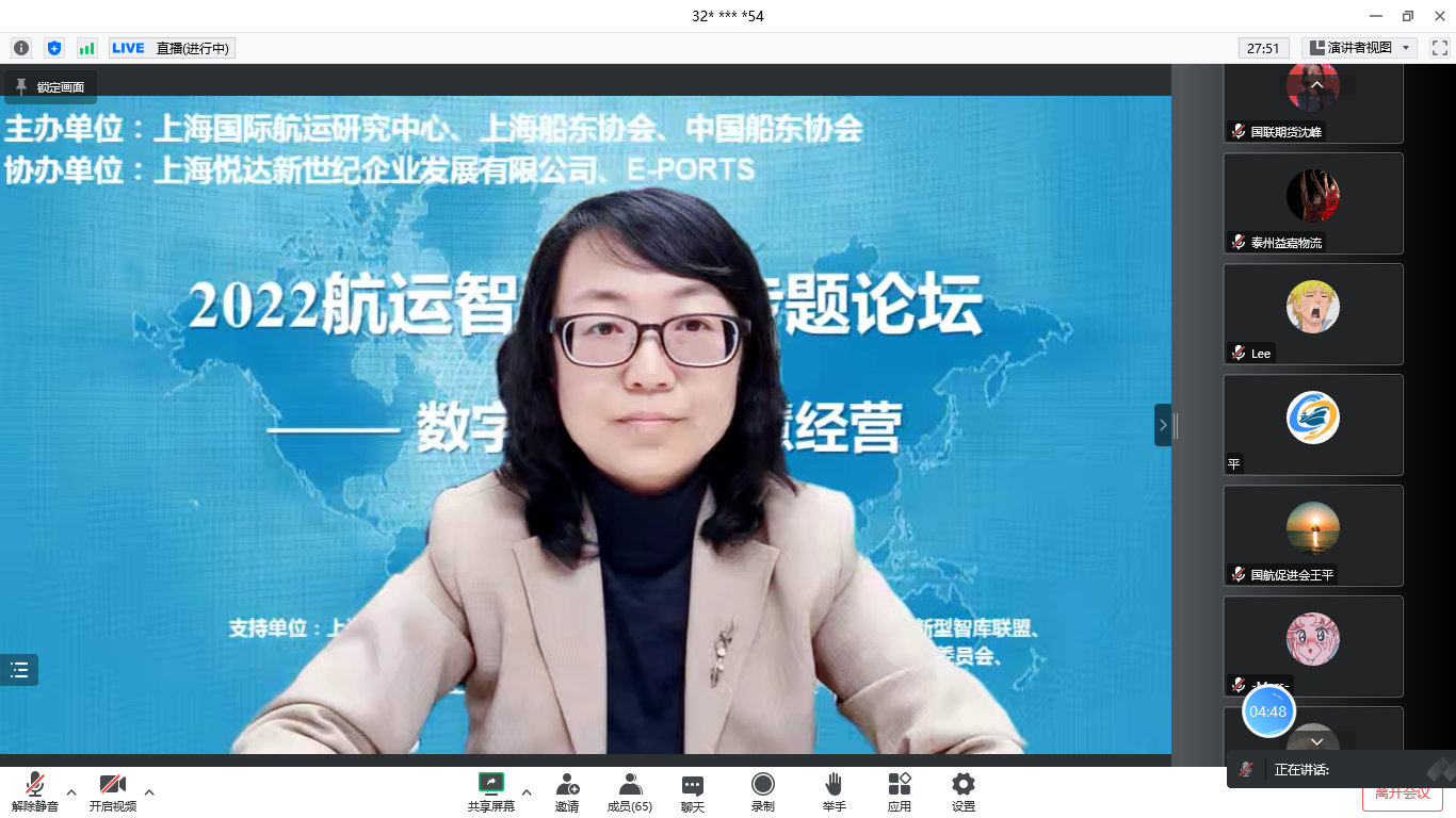 上海船东协会秘书长佟成全主持了讨论环节,富狮特航运咨询(上海)有限公司总经理施国润、上海中远船舶物资供应有限公司总经理助理叶耀辉、E-PORTS联合创始人兼副总裁官勇、元初数智科技发展集团有限公司总裁祝敏等专家共同参与,各位专家就如何推动航运数字化发表了自己的真知灼见。