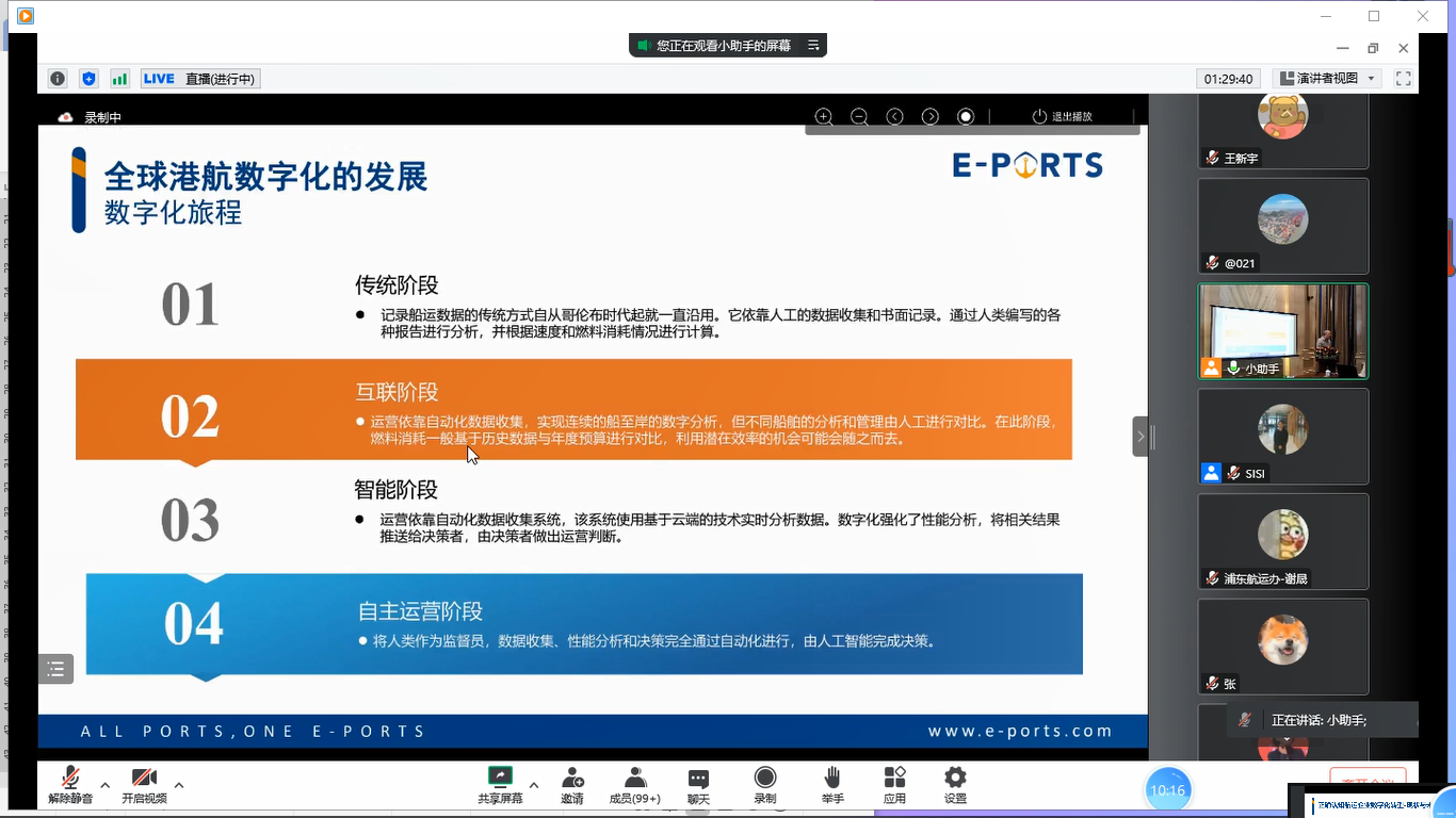 E-PORTS联合创始人兼副总裁官勇发表了题为“让船舶在网上航行--数字化在船舶供应中的应用”的主题演讲,提出全球港航数字化发展经历了传统阶段、互联阶段、智能阶段和自主运营四个阶段。航运企业数字化发展的核心需求是减少航运业务上下游复杂的角色业务系统之间的沟通成本,要以“价值链”为切入,“数据链”为主线,构建数字化的采集体系、网络化的传输体系和智能化的应用体系。航运企业数字化转型的趋势是一体化运营管理、敏捷化变革创新、智能化业务决策和生态化价值合作。传统航运企业在数字化转型中存在信息孤岛、产业结构不合理、流程冗长等问题,并介绍了E-PORTS在助力航运数字化转型方面的实践。