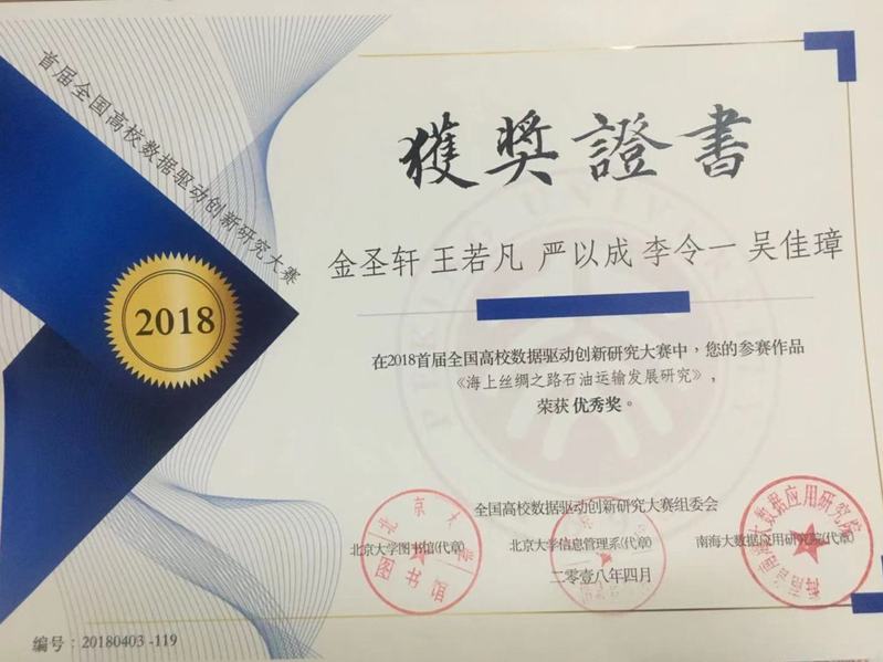 2017年,首届全国高校数据驱动创新研究大赛,大数据研究报告“海上丝绸之路石油运输发展研究”,获优秀奖,主办单位:北京大学图书馆、北京大学信息管理系、南海大数据应用研究院。