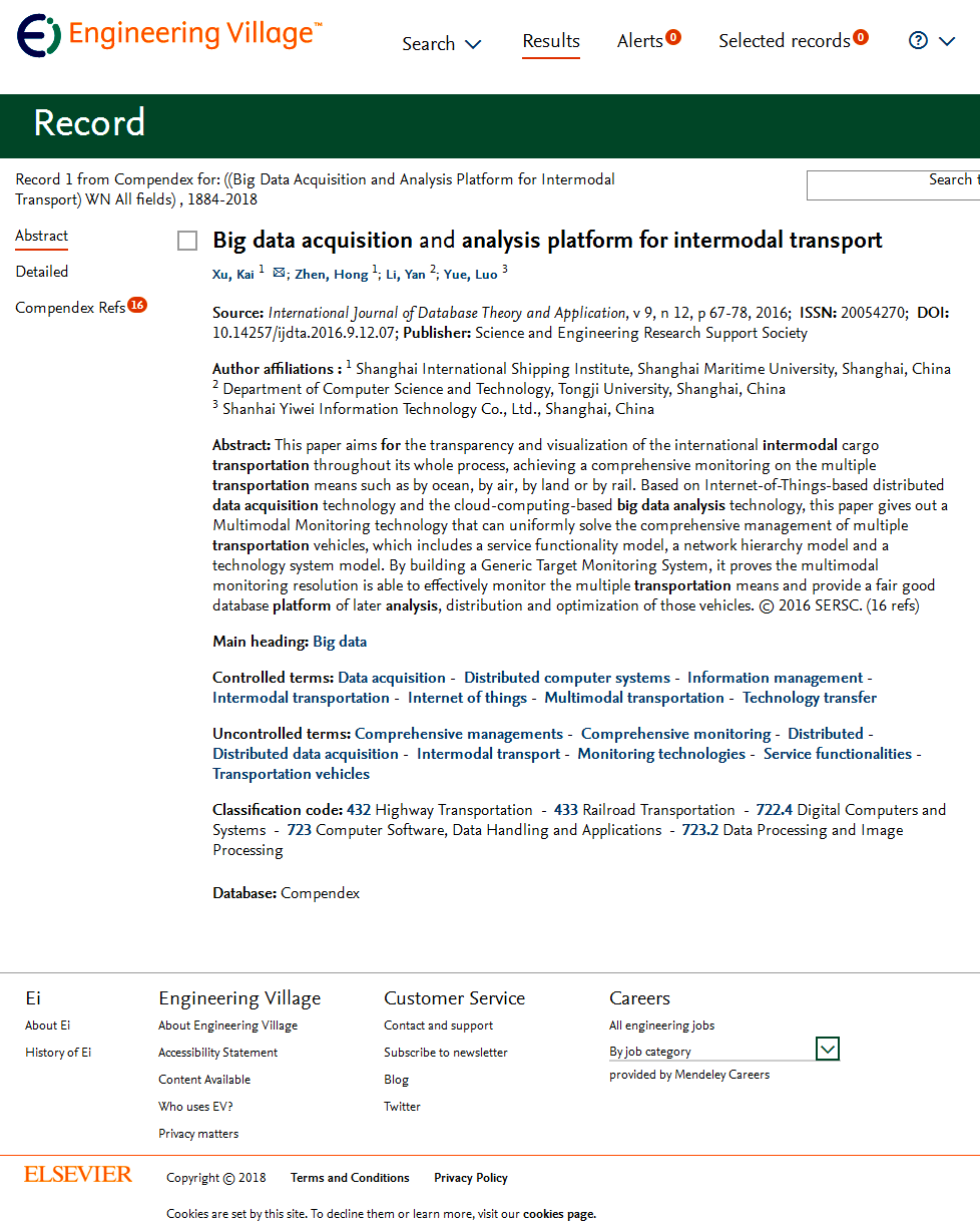 (2)论文:Kai Xu, Hong Zhen, Yan Li, Luo Yue. Big Data Acquisition and Analysis Platform for Intermodal Transport[J]. International Journal of Database Theory and Application, 2016, 9(12): 67-78. (EI期刊)
