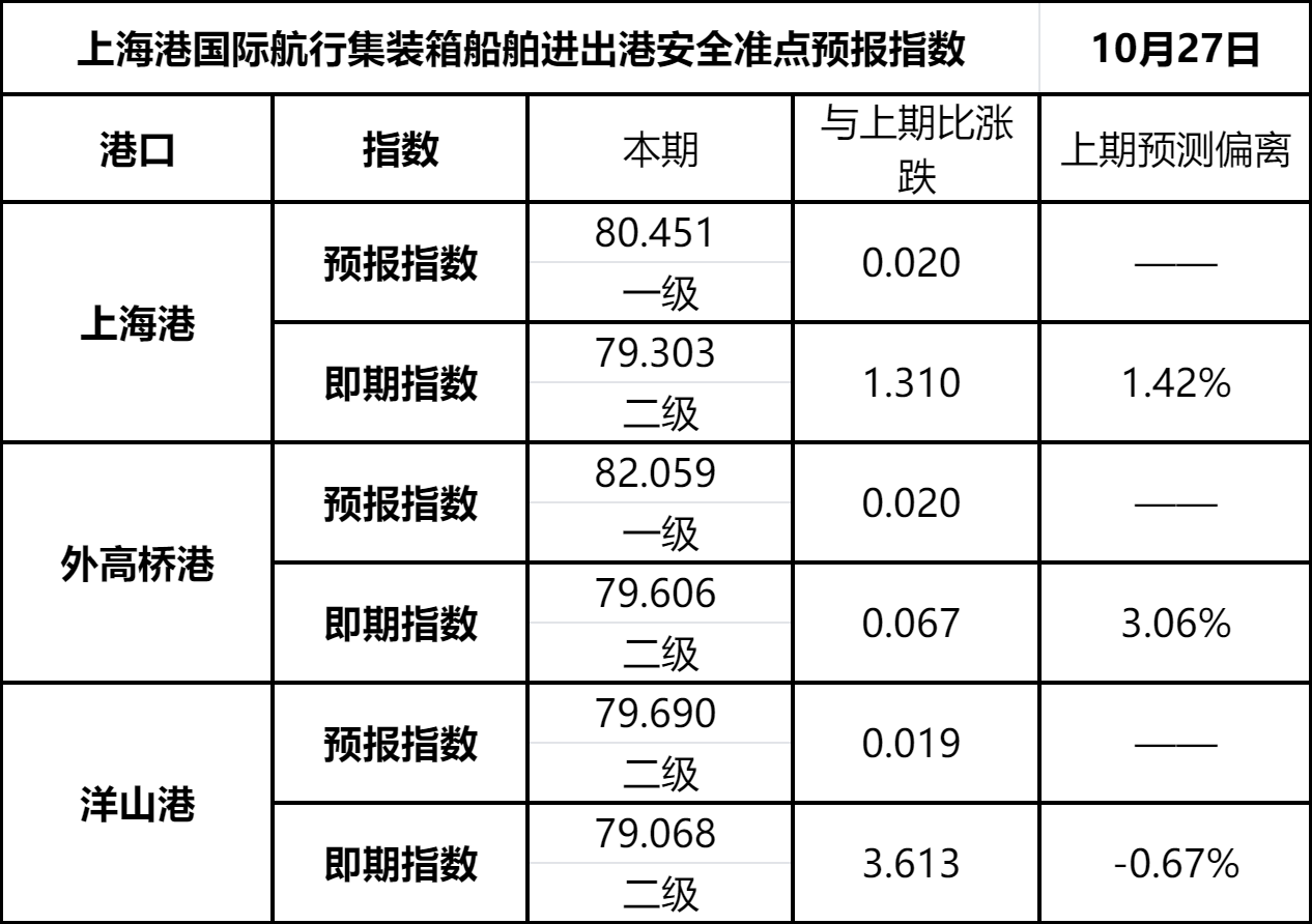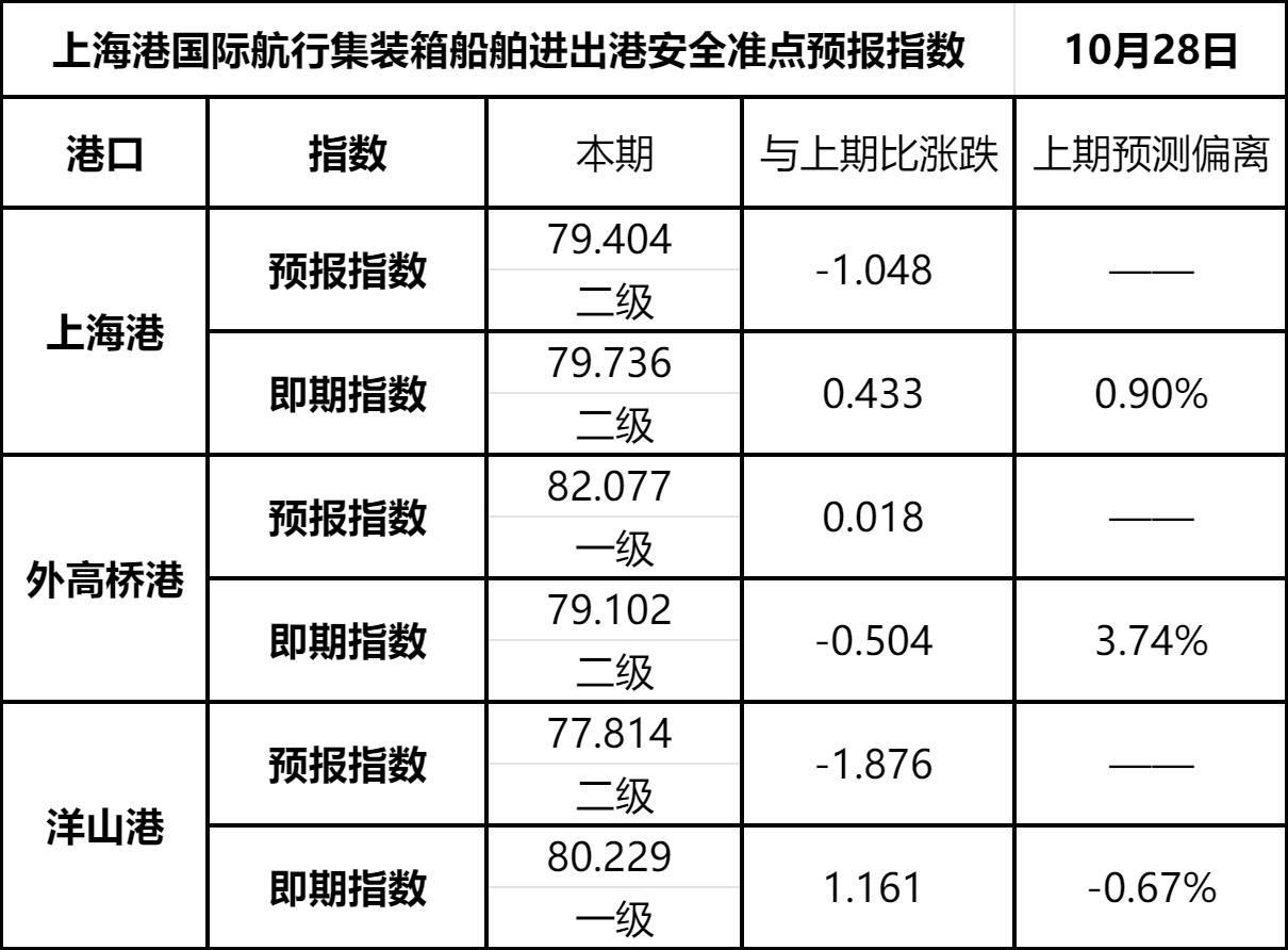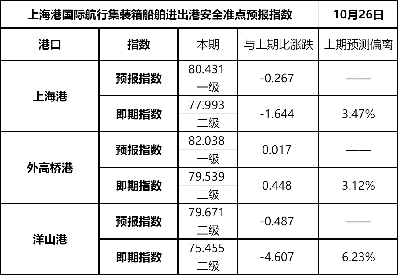 【发布】上海港国际航行集装箱船舶进出港安全准点预报指数(10.26-10.28)
