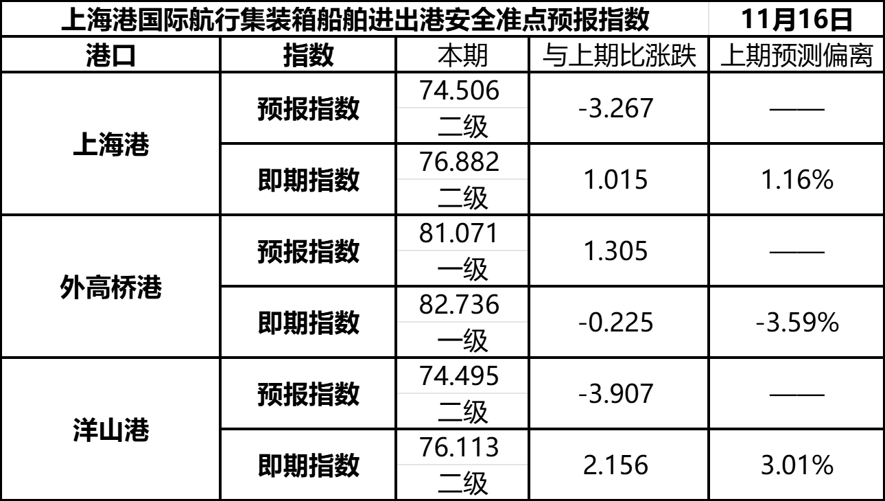 通过对上海港水域的预测通航环境、船舶预计抵港时间申报准确性(预计抵港准点率)、预测船舶航行动态等多维数据进行深入分析,形成进出港通航安全预报评价指标体系和准点预报评价规则,编制并发布上海港国际航行集装箱船舶进出港安全准点预报指数,并于每个工作日发布当天的预报指数结果(例如:10月17日发布10月17日的预报指数结果)和前一天的即期指数结果(例如:10月17日发布10月16日的即期指数结果)。