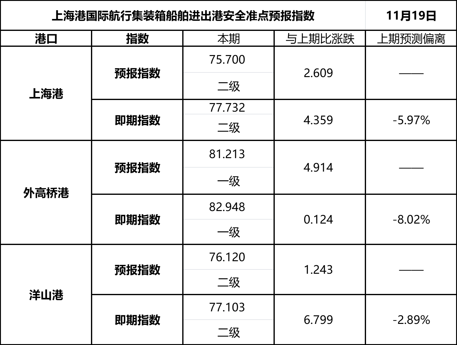 【发布】上海港国际航行集装箱船舶进出港安全准点预报指数(11.19)