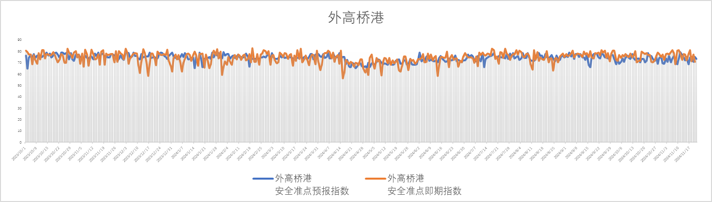 通过对上海港水域的预测通航环境、船舶预计抵港时间申报准确性(预计抵港准点率)、预测船舶航行动态等多维数据进行深入分析,形成进出港通航安全预报评价指标体系和准点预报评价规则,编制并发布上海港国际航行集装箱船舶进出港安全准点预报指数,并于每个工作日发布当天的预报指数结果(例如:1017日发布1017日的预报指数结果)和前一天的即期指数结果(例如:1017日发布1016日的即期指数结果)。
