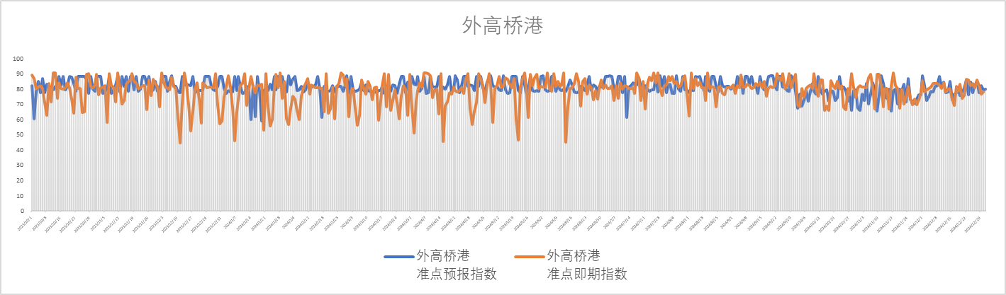 通过对上海港水域的预测通航环境、船舶预计抵港时间申报准确性(预计抵港准点率)、预测船舶航行动态等多维数据进行深入分析,形成进出港通航安全预报评价指标体系和准点预报评价规则,编制并发布上海港国际航行集装箱船舶进出港安全准点预报指数,并于每个工作日发布当天的预报指数结果(例如:1017日发布1017日的预报指数结果)和前一天的即期指数结果(例如:1017日发布1016日的即期指数结果)。