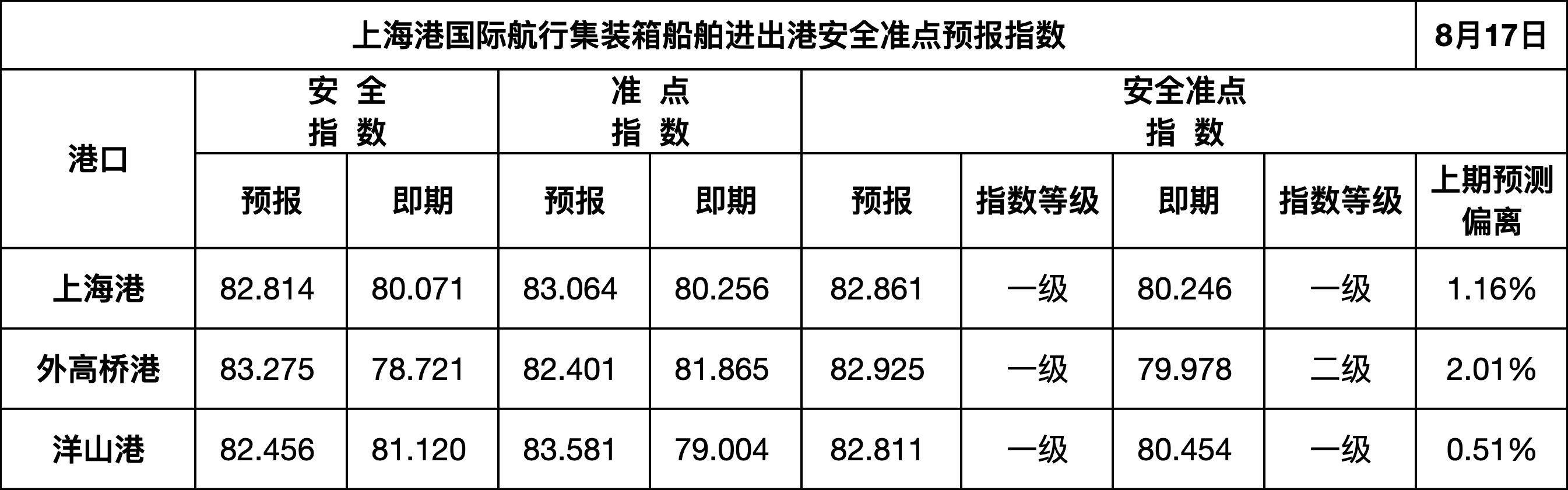 【发布】上海港国际航行集装箱船舶进出港安全准点预报指数(8.16-8.18)