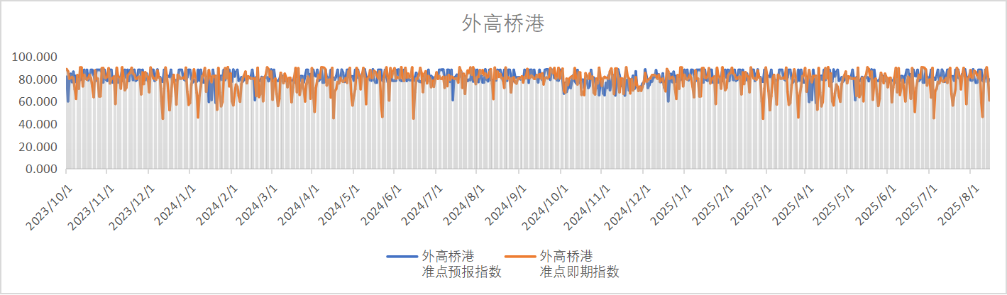 通过对上海港水域的预测通航环境、船舶预计抵港时间申报准确性(预计抵港准点率)、预测船舶航行动态等多维数据进行深入分析,形成进出港通航安全预报评价指标体系和准点预报评价规则,编制并发布上海港国际航行集装箱船舶进出港安全准点预报指数,并于每个工作日发布当天的预报指数结果(例如:1017日发布1017日的预报指数结果)和前一天的即期指数结果(例如:1017日发布1016日的即期指数结果)