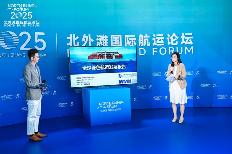 北外滩国际航运论坛影响力的提升,与上海国际航运中心的升级相辅相成,而研究中心正是这一历程的见证者与推动者。研究中心多次在北外滩国际航运论坛上发布研究成果,涵盖了从市场预测、信息化发展到航运绿色低碳等多个关键领域。10月20日,由北外滩国际航运论坛组委会主办,上海海事大学、亚洲海事技术合作中心、中国港口协会承办的2025北外滩国际航运论坛全球航运绿色发展圆桌沙龙在北外滩世界会客厅成功举办。在成果发布环节,研究中心绿色航运研究室主任赵翠云正式发布了《全球绿色航运发展报告(2024-2025年)》。10月21日,央视晚间新闻也对《全球绿色航运发展报告(2024-2025年)》的发布进行报道。
