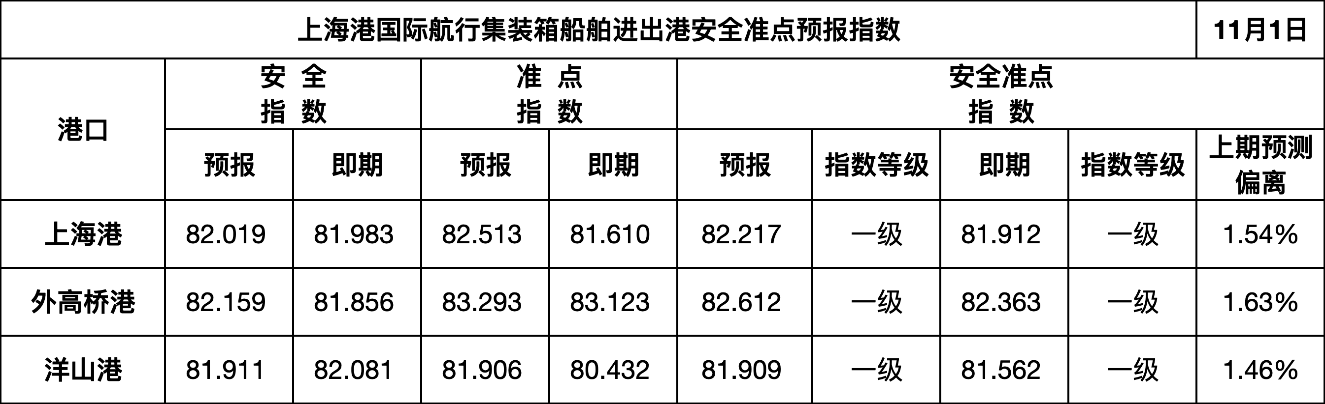 【发布】上海港国际航行集装箱船舶进出港安全准点预报指数(11.1-11.3)
