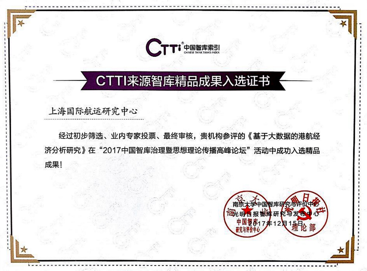 研究报告《基于大数据的港航经济分析研究》获得南大中国智库CTTI2017精品成果奖。这一成果为研究中心持续被“中国智库索引”(CTTI)收录奠定了基础。