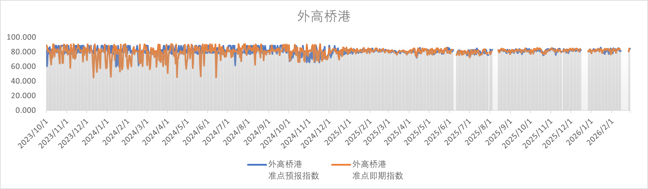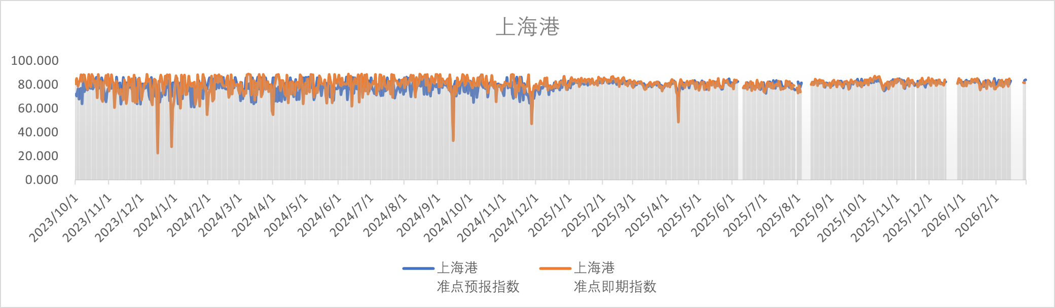 通过对上海港水域的预测通航环境、船舶预计抵港时间申报准确性(预计抵港准点率)、预测船舶航行动态等多维数据进行深入分析,形成进出港通航安全预报评价指标体系和准点预报评价规则,编制并发布上海港国际航行集装箱船舶进出港安全准点预报指数,并于每个工作日发布当天的预报指数结果(例如:10月17日发布10月17日的预报指数结果)和前一天的即期指数结果(例如:10月17日发布10月16日的即期指数结果)。
