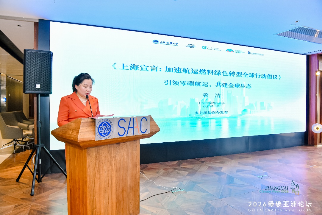 在成果发布环节,上海气候周执委会执行秘书长管洁代表多方机构联合发出《上海宣言:加速航运燃料绿色转型全球行动倡议》。
