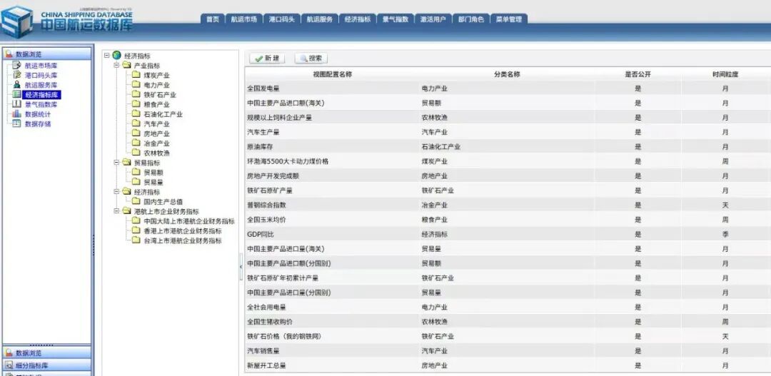 中国航运数据库是国内首创的整合国内外港航领域统计数据、信息资源的一站式公共服务平台。旨在为政府机关、航运企业、科研院校等各类用户提供便捷的查询和数据分析等功能的一站式数据服务。面向港航业提供包含航运市场、港口码头、航运服务、经济指标、景气指数5大板块指标数据。