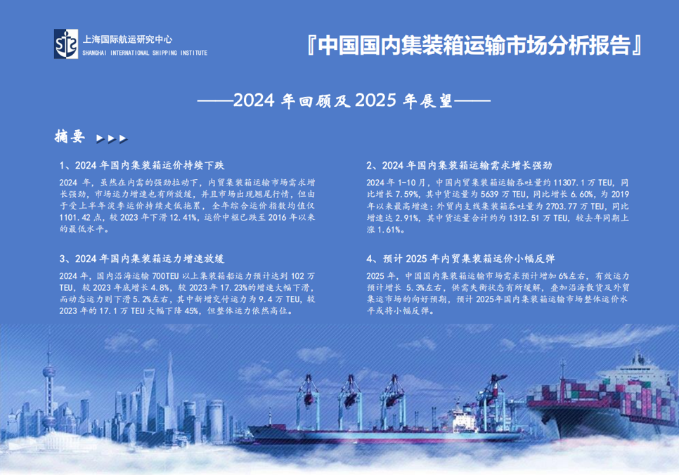 报告深耕内贸集装箱运输与内支线运输市场,拥有最全面的国内集装箱海运量数据,跟踪分析国内集装箱海运市场运力变化,采用大数据分析内贸航线运力变化和船队运营效率,并对比分析主要班轮企业的运营指标,分析预测未来市场总体走势。